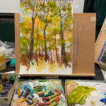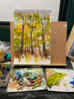 He began by working freely, using gouache, on a brush, then using inktense pencils, acrylic inks, even oil pastels, to enrich the surface, aiming to create a sense of space with many and varied textures. Starting with the lighter tones and working to darks, he explained how he avoids the” sweet “greens by adding a touch of complimentary colour (red). As the layers built he moved toward finer details in the marks with smaller brushes, painting negative space of sky in acrylic paint along with any lighter elements. The lower foreground was kept loose and dark to encourage the eye up into the high canopy.