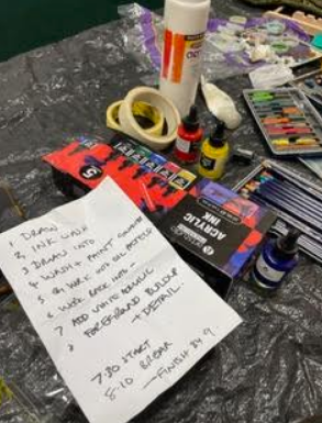 In the break we could examine other finished work, and also his materials.In true school teacher style, fairly frugal equipment, just an upturned box lid for a pallet, and well used pencils and crayons obviously with nothing going to waste!