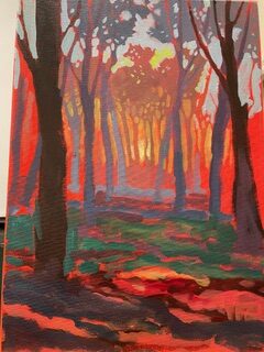 Instead of black for silhouetted foreground trees he mixed violet from blue and red, then added a little yellow, and using tonal perspective (with a gradual addition white to the mix, for violets greys,)which followed the recession in size of the trees. Background foliage and sky was painted as negative shapes around the trees ,where he could cut into the branches defining them more clearly, and with occasional glimpses of red revealed to create a glow. Adding white to yellow (for opacity )for sunlight and using this mix to “split the v’s” made branches in silhouette against a yellow sun. The final backdrop used a bright cool blue for sky (add hint of red for violet to complement the yellow,) again in negative spaces.