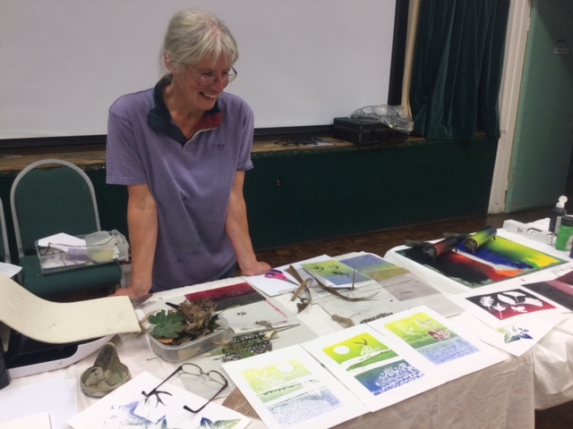 In spite of a technical hitch which meant we could not use the camera, Jackie Curtis gave us a fascinating demonstration of mono printing using natural materials such as leaves, feathers and mulberry bark. She came armed with her portable printing press, water based inks (she normally uses oil based ones) and all things necessary to produce absolutely beautiful pictures. Her prints are often produced in the open air where she gains inspiration from the countryside around her. Jackie was very generous with her advice and hints and several members had recently attended one of her workshops, organised by the SGA. If you would like to see more of her work, go to www.jcurtisart.com